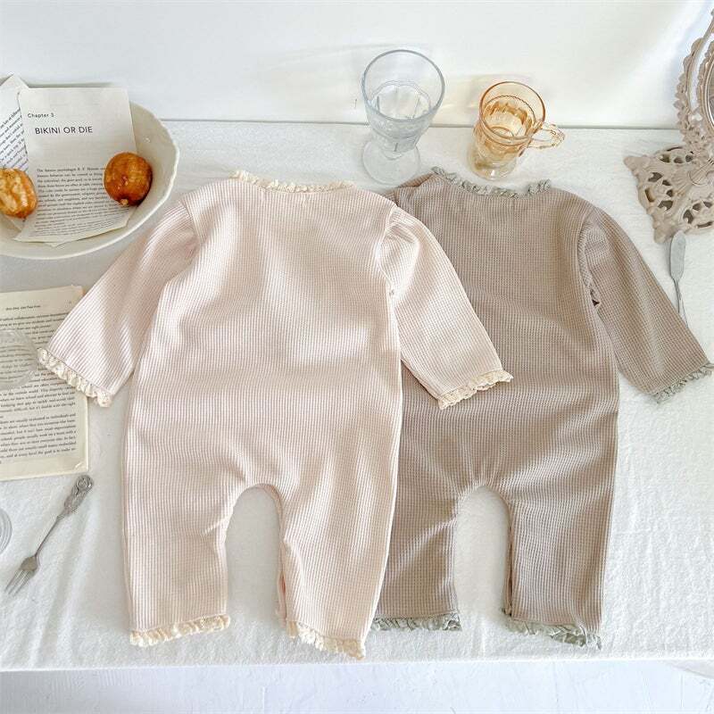 ins 秋新作 ワッフル ベビー服 ロンパース レース 長袖 カバーオール 可愛い 男女兼用